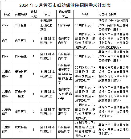 荊楚網(wǎng)(湖北日報網(wǎng))訊(記者 謝龍飛)近日,黃石市婦幼保健院發(fā)布2024年5月招聘聘用制工作人員公告,將招聘18名聘用制工作人員,涵蓋產(chǎn)科醫(yī)生、內(nèi)科醫(yī)生、精神科醫(yī)生、兒科醫(yī)生等,具體崗位詳見下表。