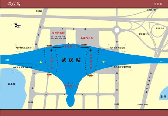 武漢站的設(shè)計(jì)采用四層的立體結(jié)構(gòu)。最上面一層為候車區(qū)和售票區(qū),下面一層為乘車區(qū),檢票后,旅客可以乘電梯直接下到動(dòng)車旁。再下面為地面層,用于旅客出站以及社會(huì)車輛停車。最下面一層為地下層,為地鐵準(zhǔn)備,目前正在施工中。