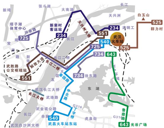 據(jù)悉,春運(yùn)期間,將根據(jù)客流變化情況,調(diào)整增加武漢站上述7條公交線路運(yùn)力,還將開通武漢站至漢口站的大站快車線路。走向?yàn)椋何錆h站經(jīng)白云路、團(tuán)結(jié)大道、建設(shè)十路、友誼大道、長江二橋、黃浦大街、發(fā)展大道、常青路至漢口站。