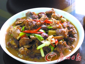 酸筍炒鴨:南雄的鴨子肉質(zhì)豐厚,口感柔軟,最要嘗的是酸筍炒鴨,用新鮮鴨肉拌著酸筍、辣椒,先炒至金黃,再燜至爛熟,酸筍的酸味和辣椒的辣味都完全滲入到鴨肉里面去,酸味伴著辣味,還有鴨肉本身的肉香,只吃一塊,就會讓你胃口大開,忍不住要多吃兩口飯。其實在平常人家,若是做這種酸筍鴨,一定要隔餐吃,才覺得好味的。因為肉汁很濃香,材料的味道大多留在了肉汁里,即使?fàn)F得再爛也是不能完全滲透到肉里面,若是隔了一餐來讓它入味,再重新燉熱,則更加能體會到酸筍鴨的無窮風(fēng)味。