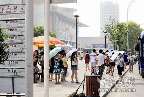 前日,江城最高氣溫突破37度酷暑線。中午12時(shí),記者來到漢口火車站,公交候車區(qū)聚集了10多條公交路線。記者撐著傘在太陽底下站了不到10分鐘,已覺得皮膚火辣辣的。