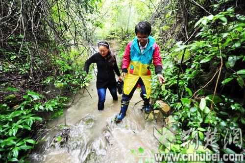 一路的泥濘。3個人穿過大片的莊稼地、鉆進灌木叢,沿山澗小溪一路尋去,直到約兩公里外的一處“小瀑布”旁。