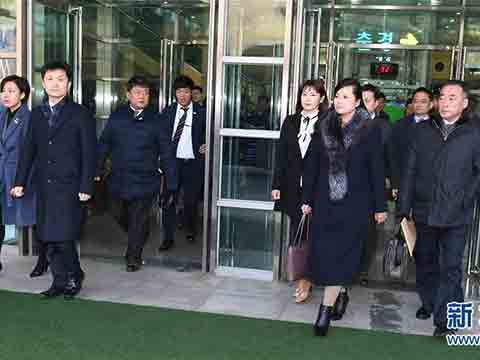 1月21日,朝鮮三池淵管弦樂團(tuán)團(tuán)長玄松月(前右二)通過朝韓邊境的韓國京畿道坡州市京義線韓朝出入境事務(wù)所前往韓國首爾。當(dāng)日,朝鮮方面派遣三池淵管弦樂團(tuán)團(tuán)長玄松月率領(lǐng)的考察團(tuán)經(jīng)由京義線陸路抵韓,為平昌冬奧會(huì)之際舉行的文藝演出進(jìn)行事先考察。(新華網(wǎng))
